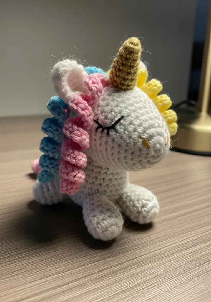 This adorable unicorn is worked in creamy white yarn with neat, compact stitches that shape its tiny body and legs. A golden horn rises from its forehead, and the curly rainbow mane flows along its neck in soft pastel shades. Closed embroidered eyes give it a peaceful, dreamy expression. The colorful details contrast beautifully against the simple white base.