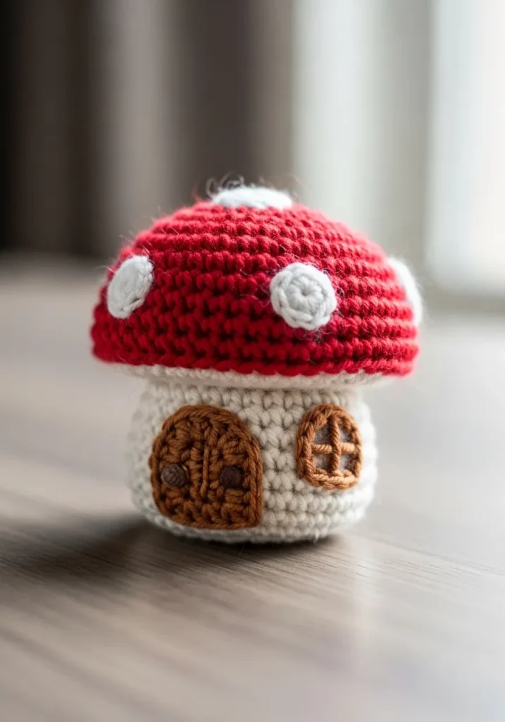 This tiny mushroom house is crocheted with a bright red cap dotted with white circles, paired with a soft cream stem. The little stitched door and window details give it a storybook feel. The rounded cap sits snugly on top, and the tight stitches keep everything nicely structured. It looks like it belongs in a fairy garden.