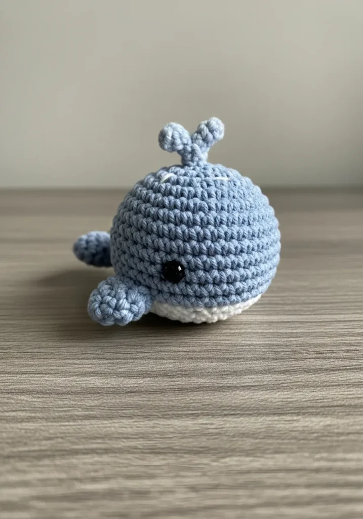 This mini whale is crocheted in a soft gray blue yarn with tight, smooth stitches that give it a clean and polished look. The rounded body, tiny side fins, and small tail create a perfectly balanced silhouette. Glossy safety eyes add a gentle expression, and the compact size makes it ideal for display or gifting.