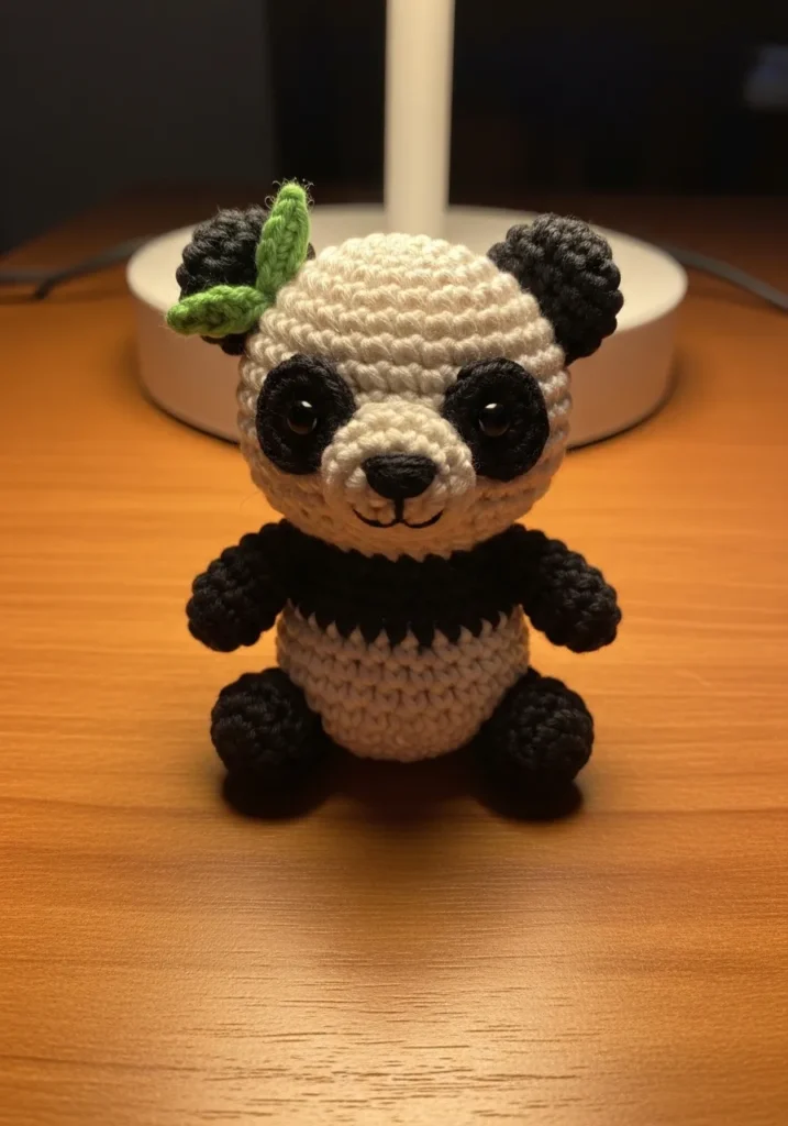 This mini amigurumi panda is crocheted in classic black and cream yarn with tight, even stitches that give it a neat and polished look. The oversized glossy eyes add an extra dose of cuteness, while the small rounded ears and stubby arms keep the shape compact and balanced. A tiny green bamboo leaf detail near its head brings in a playful pop of color. Its palm sized body makes it perfect for sitting sweetly on a desk or shelf.