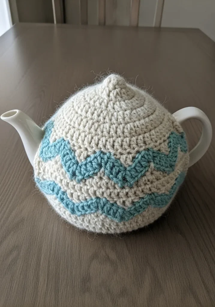 This charming tea cozy features a classic chevron pattern in a refreshing mix of cream and soft teal yarn. The texture is wonderfully rustic with a slightly fuzzy finish that hints at a cozy wool or acrylic blend. The design uses a series of ripples to create that iconic zigzag effect, hugging the curves of the teapot perfectly while leaving space for the spout and handle. It essentially turns a standard kitchen staple into a stylish centerpiece that feels both nostalgic and modern.