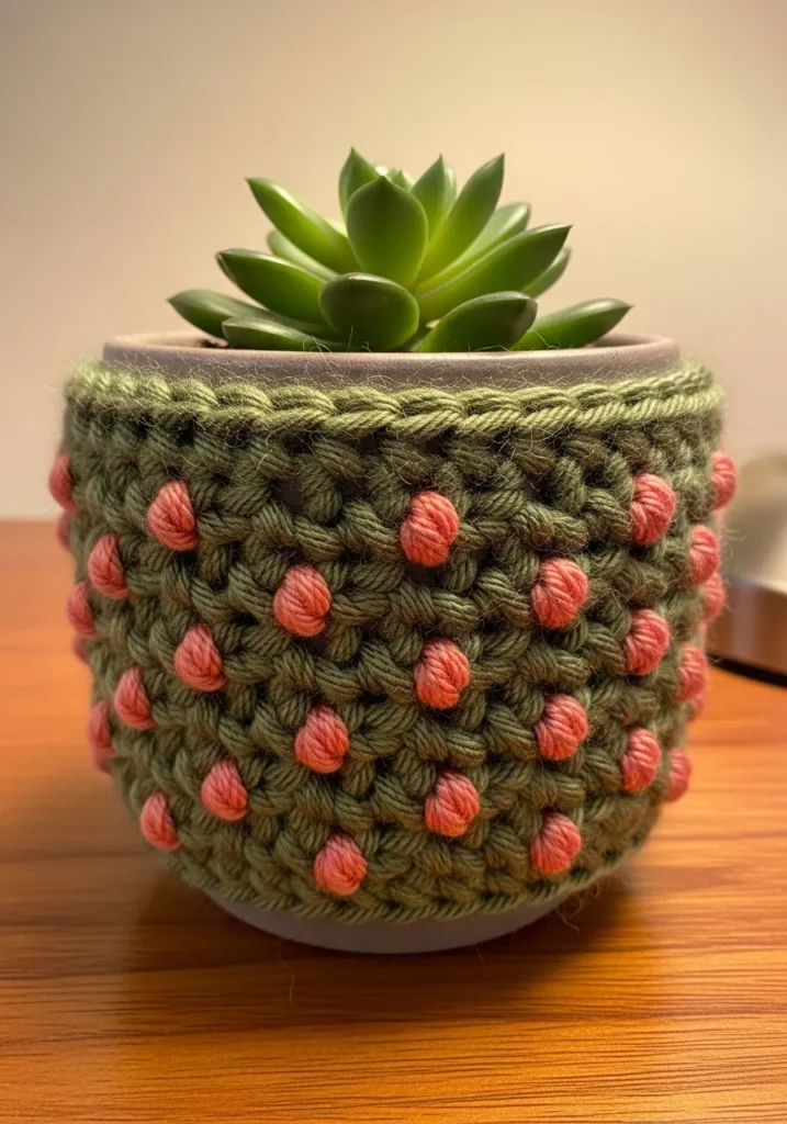 This charming crochet sleeve brings a burst of personality to a standard terra cotta or ceramic pot. The design features a deep mossy green base worked in a thick cotton yarn, which provides a sturdy and tactile foundation. What really sets this piece apart are the scattered coral pink bobble stitches that pop out like tiny desert flowers or succulent buds. The top edge is finished with a clean braided rim that hugs the pot perfectly and creates a polished look for your indoor greenery.