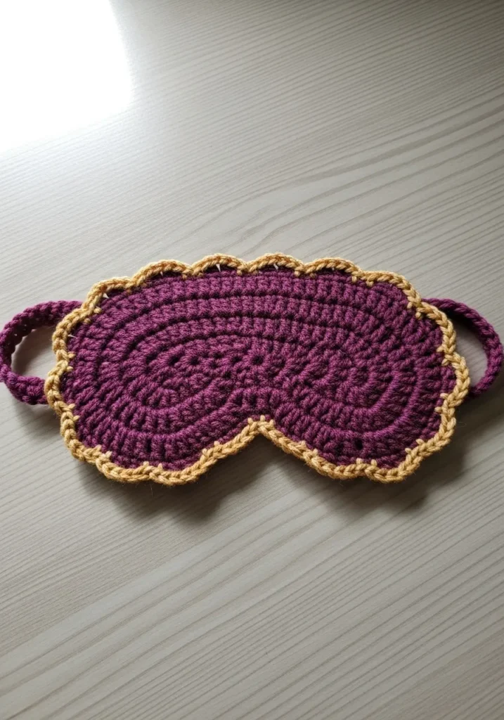 This elegant eye mask features a rich plum purple base worked in dense double crochet stitches to ensure total light blockage for a peaceful nap. The piece is framed by a delicate golden yellow scalloped border that adds a vintage touch and creates a beautiful color contrast. Made from soft cotton or bamboo yarn, the texture feels smooth against the skin while the sturdy matching straps keep it securely in place without snagging your hair. The overall design mimics high fashion loungewear while remaining a practical accessory for travel or deep sleep.