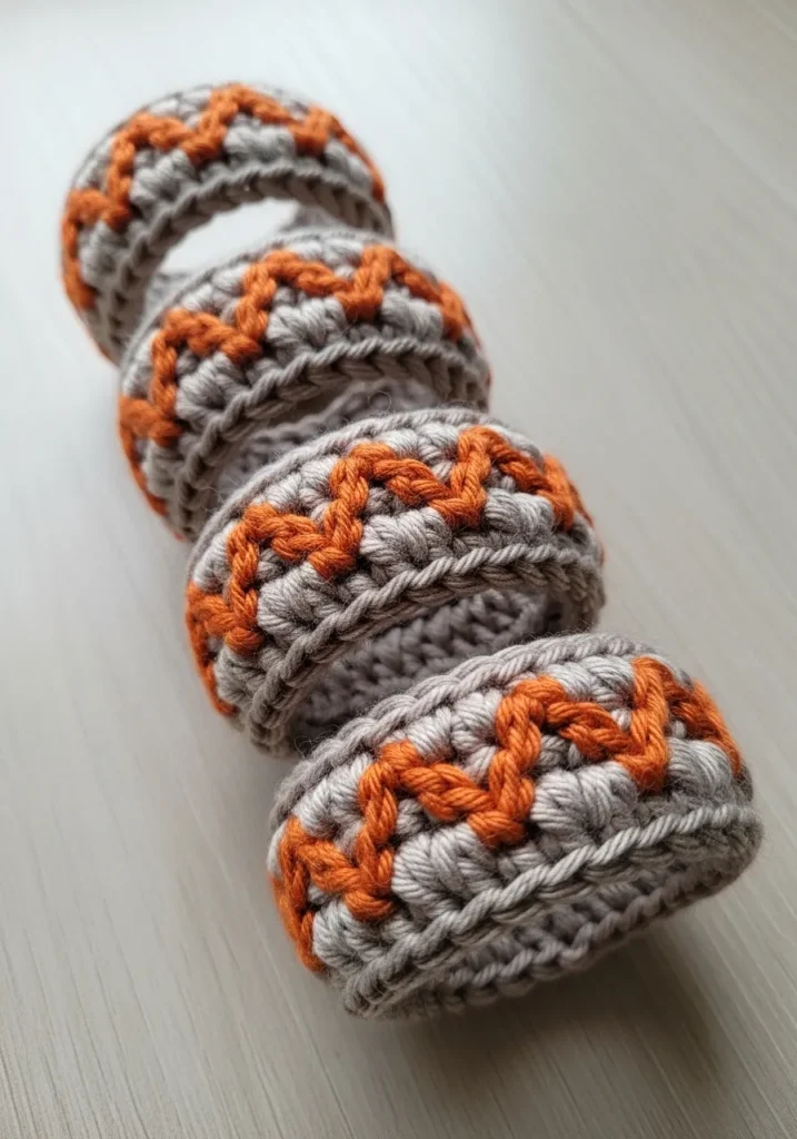These stylish napkin rings feature a sophisticated textured design using a thick oatmeal-colored cotton yarn as the base and a vibrant pumpkin orange for the decorative overlay. The main body is worked in sturdy single crochet rounds while the orange zigzag pattern creates a raised 3D effect that mimics intricate embroidery. The combination of the neutral taupe background and the pops of rust-colored yarn gives these accessories a modern rustic vibe that feels cozy yet polished. They have a firm structure that holds its shape perfectly, and the chunky knit texture adds a lovely tactile element to any table setting.