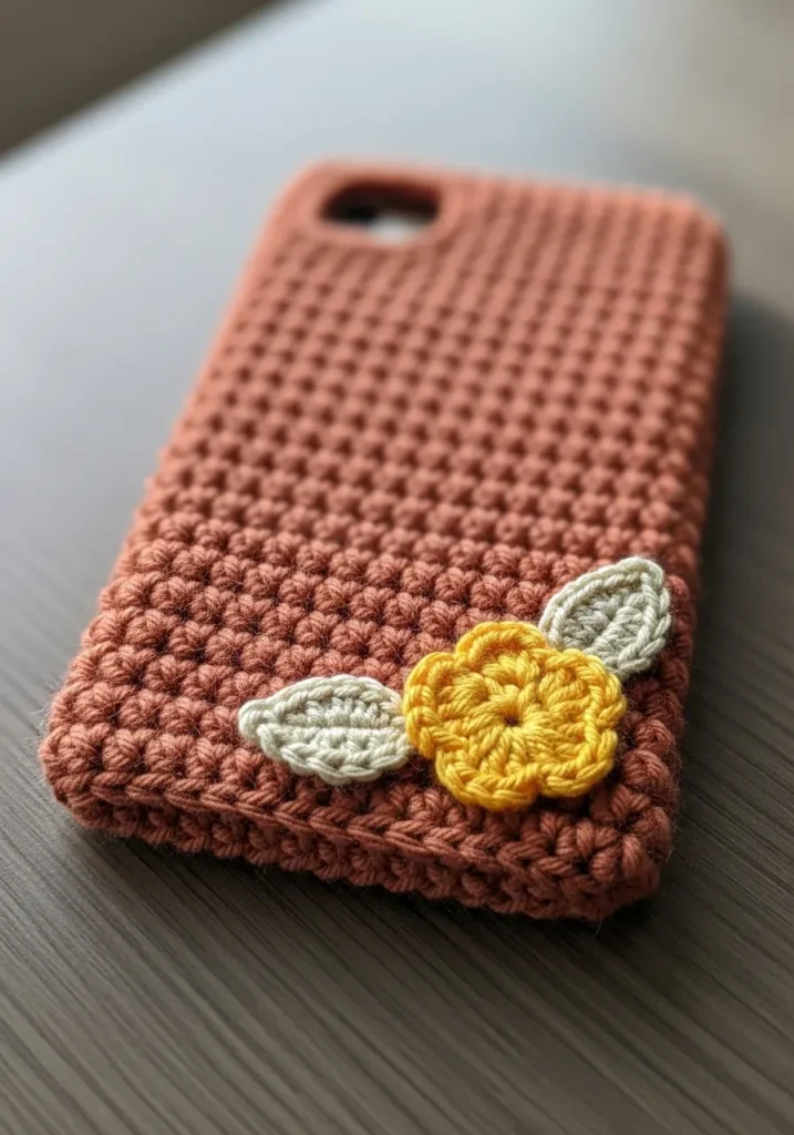 This terracotta crochet phone case features a thick and sturdy texture that looks way more complicated than it actually is. The main body is worked in a dense waffle-like stitch that provides excellent padding for your device while giving off a cozy and modern vibe. To break up the solid earthy tone, a sunny yellow five-petal flower and two sage green leaves are appliquéd onto the bottom corner. The combination of the burnt orange base with the bright floral accents creates a beautiful contrast that feels very high quality without the stress of a complex pattern.
