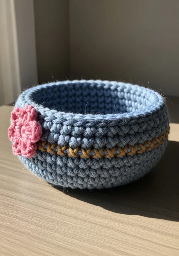 This charming little catch-all is a fantastic example of how a simple silhouette can be transformed with just a few clever accents. The body is worked in a thick dusty blue cotton yarn using tight stitches that give the bowl a sturdy, structured feel. A contrasting golden honey yarn is woven through one of the middle rounds to create a chic braided texture that wraps all the way around. The real star is the delicate pink puff stitch flower perched on the side, which adds a soft, feminine touch to the rugged texture of the basket. It is a perfect balance of rustic utility and cottagecore vibes.