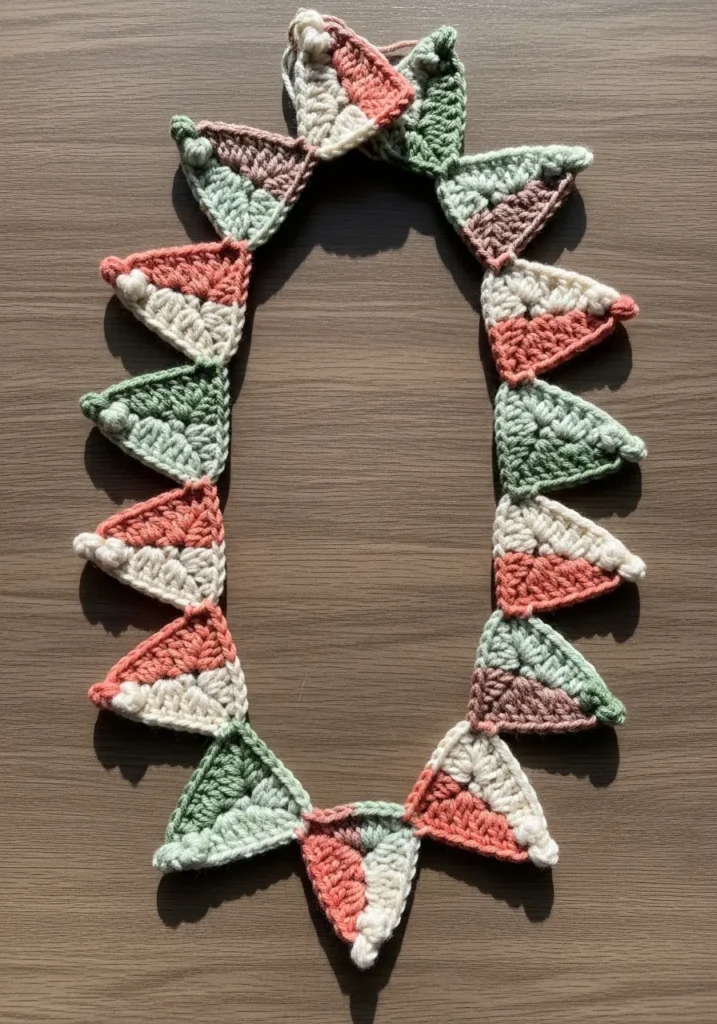 This charming garland features a series of bi-colored crochet triangles strung together to create a whimsical pennant banner. The design uses a soft palette of sage green, dusty rose, and creamy off-white yarn, which gives it a modern yet cozy aesthetic. Each triangle is worked in a textured double crochet stitch with a playful bobble accent at the tips for added dimension. The chunky texture of the yarn makes the geometric shapes pop against any wall, while the alternating color blocks keep the visual interest high throughout the entire length of the string.