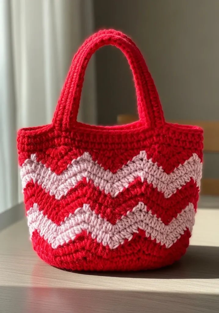 This charming mini tote features a bold zigzag chevron pattern in alternating rows of cherry red and soft petal pink. The texture is wonderfully chunky because it uses a thick cotton or acrylic blend yarn that makes the stitches pop and helps the bag hold its shape without needing a liner. The sturdy handles are crocheted directly into the top edge using simple single crochet stitches for maximum durability. It has a modern yet playful design that feels like something you would find in a boutique gift shop.