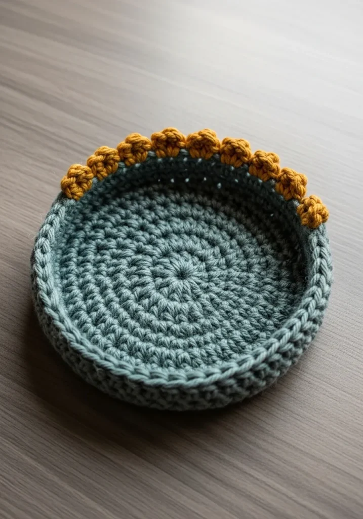 This charming little bowl features a sturdy base worked in a muted sage green cotton yarn that gives it a clean and modern feel. The design uses basic stitches worked in the round to create a firm structure that holds its shape perfectly on a bedside table or entryway console. What really sets this piece apart is the vibrant mustard yellow border made of tiny popcorn stitches. These little bursts of texture look like a crown of golden petals and provide a beautiful contrast against the cool tones of the bowl. It feels substantial and soft to the touch with a classic handmade aesthetic that fits right into any cozy home setup.