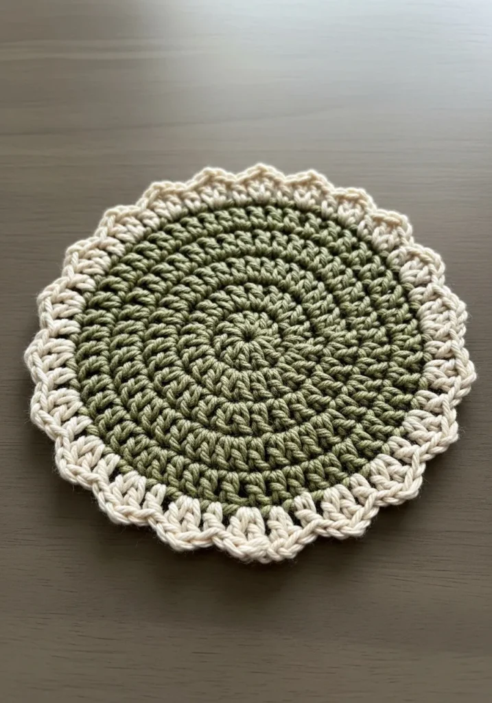 This dainty circular mat features a rich forest green center worked in tight spiral rounds that show off every crisp stitch. The texture is wonderfully dense and sturdy, making it a reliable base for a chunky pillar candle or a favorite glass jar. Around the edge, a creamy off-white yarn creates a delicate scalloped border that pops beautifully against the darker green. It has a lovely earthy vibe with a touch of vintage charm, and the cotton yarn gives it a matte, high-quality finish that looks far more expensive than it actually is to make.