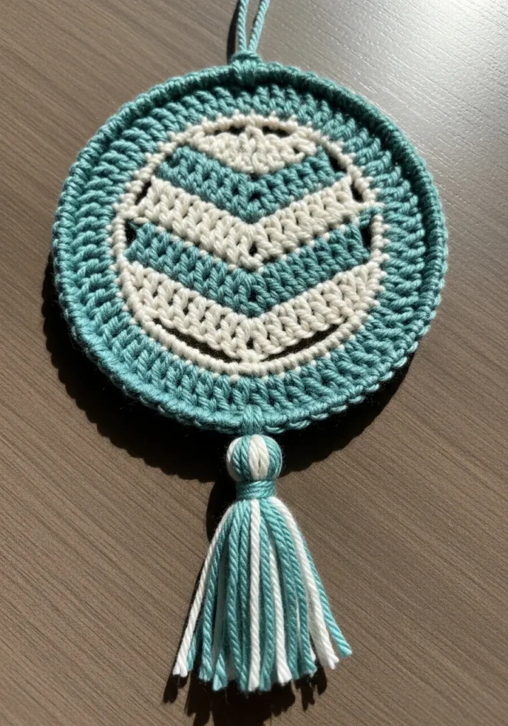 This whimsical dreamcatcher trades in the traditional web for a bold, geometric center featuring alternating rows of teal and cream chevrons. The design is worked in sturdy cotton yarn, giving it a modern, clean texture that feels much more substantial than your average wall decor. I find the contrast between the sharp V-shaped stitches and the soft, circular frame creates a beautiful visual balance that fits right into a minimalist or bohemian bedroom. The thick, two-tone tassel at the base adds a lovely bit of weight and flair, making the whole piece feel like a high-quality find from a local craft fair.
