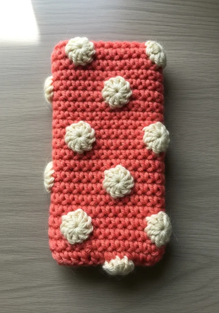 This adorable eyeglass case features a vibrant coral pink base worked in a dense single crochet stitch to keep your frames safe and scratch-free. The standout detail is the scattered array of creamy white puff stitches that look just like tiny fluffy flowers or oversized polka dots. These raised accents add a wonderful 3D texture and a soft, squishy feel to the overall design. The simple envelope shape is finished with a clean edge that highlights the contrast between the warm peach tones and the bright white yarn.