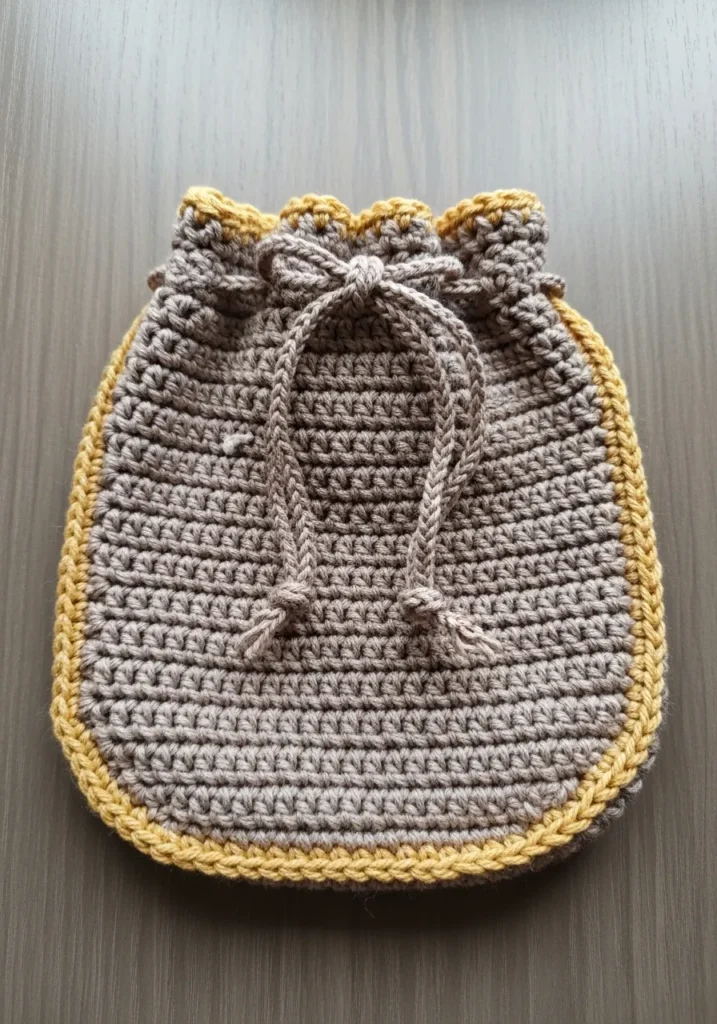 This adorable drawstring pouch is a masterclass in using simple stitches to create a high-end look. It features a sturdy body worked in a soft taupe yarn using what looks like half double crochet stitches for a dense and reliable texture. The rounded bottom gives it a lovely organic shape, while the contrasting mustard yellow border adds a pop of sophisticated color around the edges and the scalloped top. A matching braided cord serves as the closure, finished with simple knots that keep the aesthetic clean and functional. It is the perfect size for holding jewelry, tech cables, or small crochet hooks.