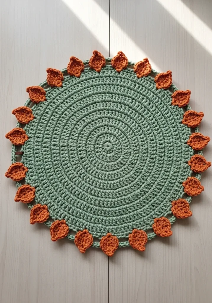 This circular table centerpiece showcases a soothing sage green base crafted with neat concentric rounds that provide a lovely tactile weight. The piece is finished with a striking border of delicate burnt orange leaves that sit beautifully against any wooden or neutral tabletop. Using a matte cotton yarn gives the entire project a modern rustic aesthetic that feels both substantial and soft to the touch. The design balances the simplicity of the solid green interior with the intricate look of the leafy fringe, creating a balanced focal point for a dining area or a coffee table.