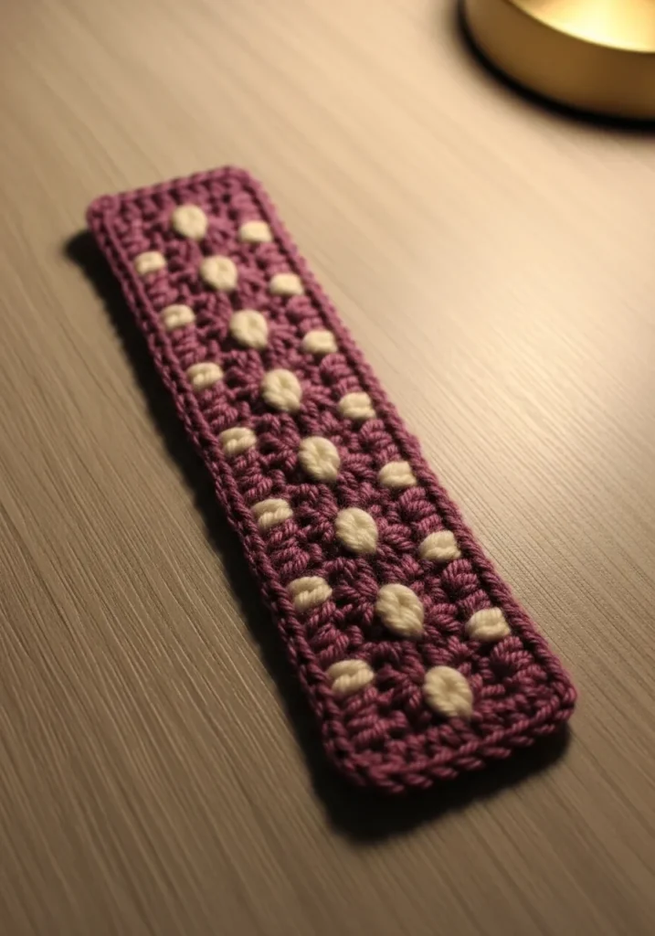 This charming rectangular bookmark features a rich plum purple base accented by raised cream-colored polka dots. The texture is created using a classic bobble or popcorn stitch, which gives the piece a tactile 3D effect that pops right off the surface. It is worked in a sturdy cotton yarn that feels smooth to the touch and ensures the bookmark stays flat between the pages of your favorite novel. The edges are finished with a clean border of single crochet stitches to give it a polished and professional look.