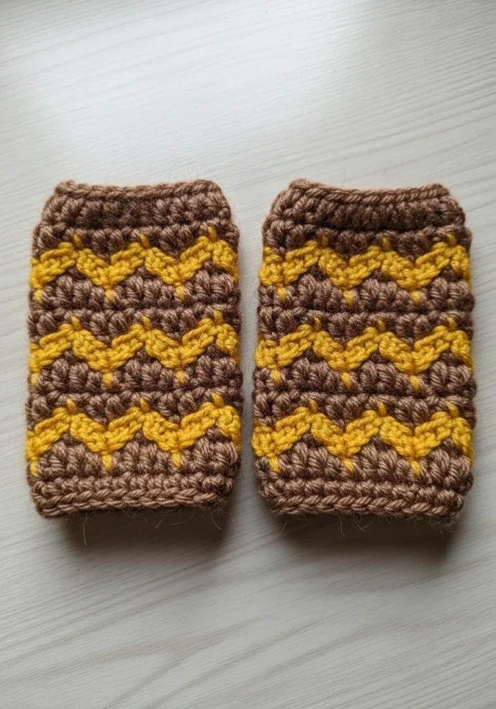 These stylish wrist cuffs feature a bold zigzag pattern that looks way more complicated than it actually is. The design blends a warm cocoa brown with a sunny mustard yellow to create a cozy autumnal vibe. You can feel the squishy texture just by looking at the raised stitches and the thick ribbed borders that keep everything securely in place. The compact size makes them a fantastic way to experiment with color work without committing to a massive blanket or a full sweater.