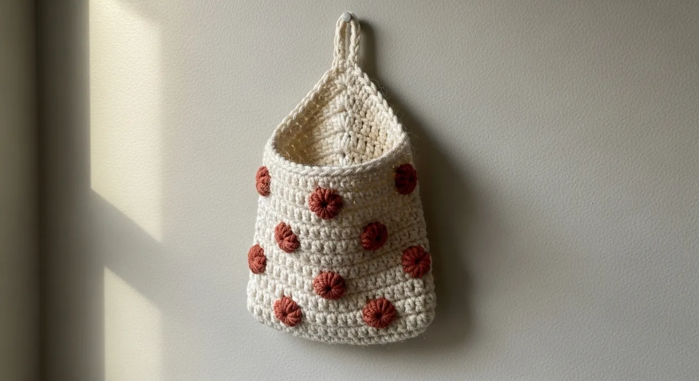 This adorable hanging storage basket features a creamy off-white base with chunky terra cotta bobble stitches scattered across the front like playful polka dots. The texture is thick and sturdy because it uses a heavy cotton or acrylic blend yarn that helps the basket keep its rounded shape even when it is empty. I love how the ribbed top edge transitions smoothly into a handy loop for hanging on any wall hook. The contrast between the smooth cream rows and those raised reddish-brown accents gives it a sophisticated boutique look without needing complicated colorwork.
