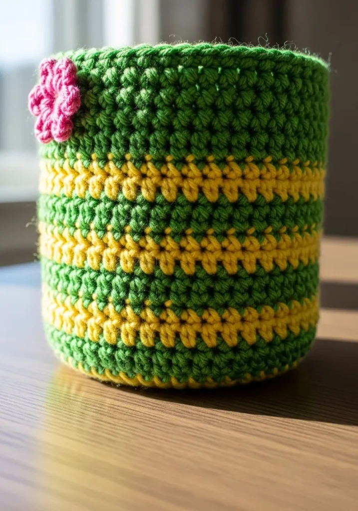 I think this is such a brilliant idea for beginners because it is basically a simple rectangle joined at the ends or worked in easy rounds. You don’t have to worry about complicated shaping or increasing, which makes it a very relaxing win for your first few projects. If you are looking to hide a boring plastic container, this is your new best friend. It is honestly so satisfying to see how a little bit of leftover yarn can completely change the mood of your favorite indoor plant.
