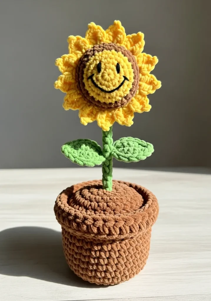 This darling sunflower features a velvety texture thanks to the use of super soft chenille yarn in cocoa brown and bright amber. The design showcases a happy face worked into the golden center with tiny black eyes and a wide stitched grin that instantly warms up the room. Sturdy green leaves and a wrapped stem give the flower some height, while the base is a perfectly shaped brown crochet pot that mimics real soil with its dense, rippled stitches. It is a completely self-standing piece of soft sculpture that combines a whimsical toy feel with the look of a boutique home accessory.