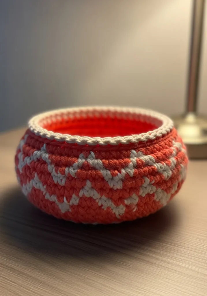 This sophisticated little bowl uses a lovely salmon pink yarn paired with crisp white to create a striking mountain peak pattern around its curved sides. The design features a rounded globular shape that tapers slightly toward the top finished with a sturdy white decorative rim that holds its form beautifully. Each stitch is tightly packed giving the bowl a dense and durable texture that feels premium to the touch. The contrast between the warm coral tones and the snowy white zigzags makes it a standout piece for any bedside table or vanity.