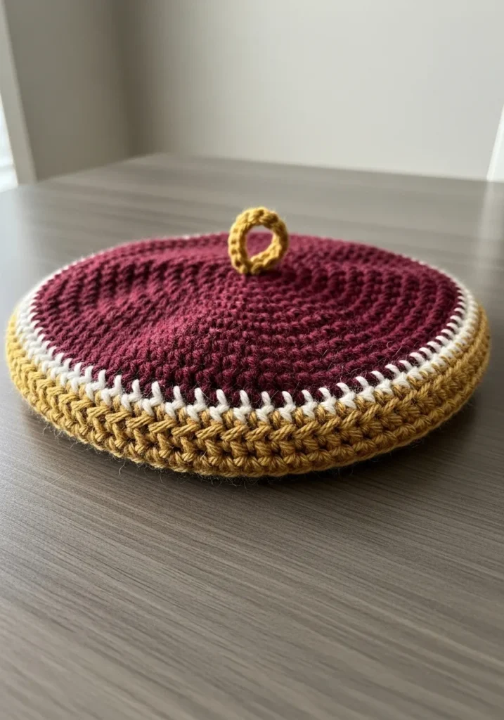 This elegant headpiece captures a classic Parisian vibe with a rich maroon center that radiates outward in smooth concentric circles. The deep wine-colored yarn has a soft matte finish that looks incredibly cozy and warm for those brisk morning strolls. Around the edge, a crisp white border transitions into a wide mustard yellow band worked in a textured herringbone-style stitch, which provides a snug and stylish fit. To top it all off, a tiny golden loop sits right at the center point, giving it that authentic artistic flair we all love in a traditional beret.