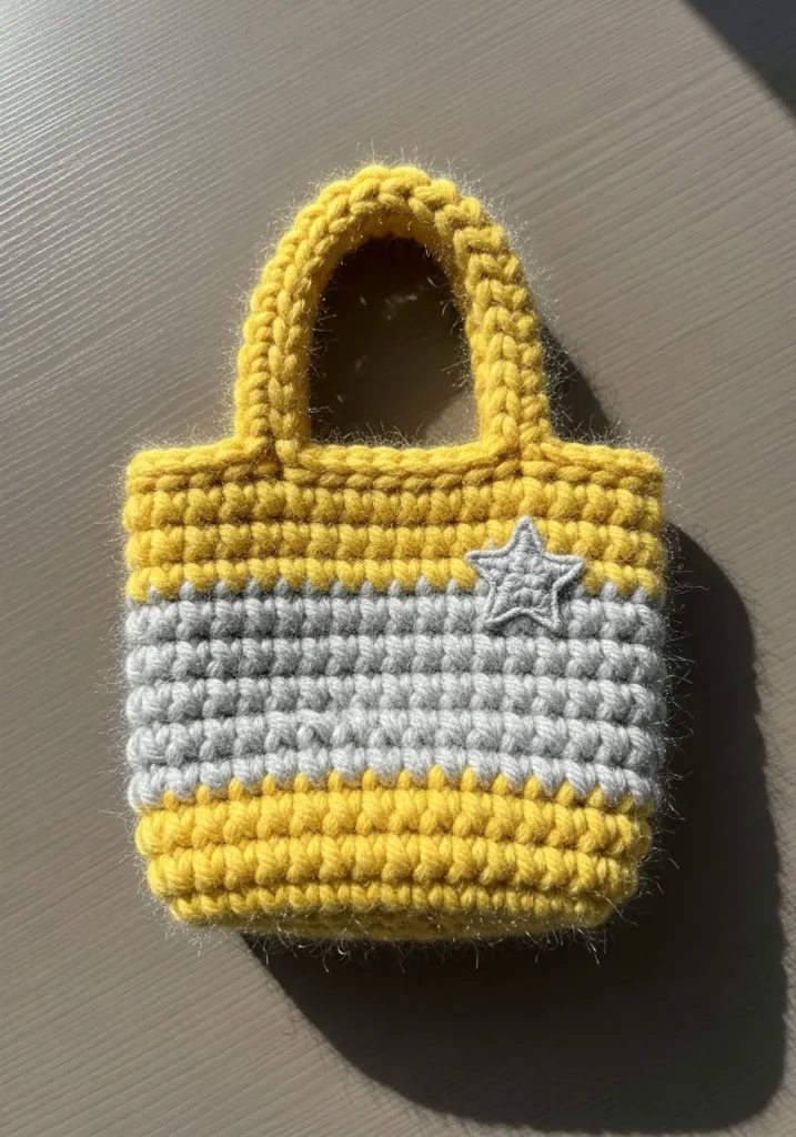 I think this mini tote is a total winner for anyone looking to practice their “carrying” skills because the transition between the gray and yellow rows is so clean and satisfying. If you are intimidated by big projects, this tiny version of a classic market bag lets you get that finish-line high in a fraction of the time. It is such a creative way to use up those extra bits of chunky yarn you have lying around while making something that feels high-end and super trendy. Honestly, adding that little star is the ultimate cherry on top that makes the whole piece feel like a special custom find.