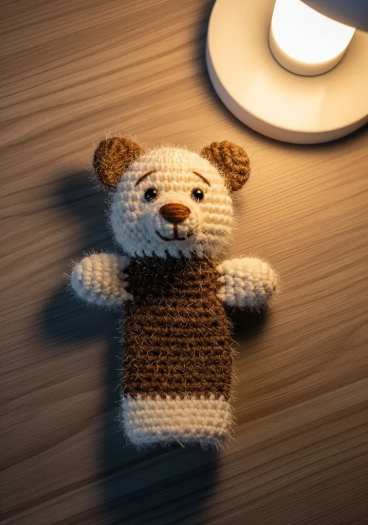 This darling forest friend features a soft cream-colored head paired with a rich chocolate brown body for a classic teddy bear look. The design uses fuzzy, medium-weight yarn that creates a wonderfully tactile and comforting surface, perfect for gentle play. Those tiny, rounded ears and the stitched-on chocolate nose give it a gentle, friendly expression, while the long, rectangular body provides plenty of room for a hand to fit inside comfortably. It has a lovely ribbed white trim at the very bottom, which adds a clean, finished touch to the base of this handmade character.