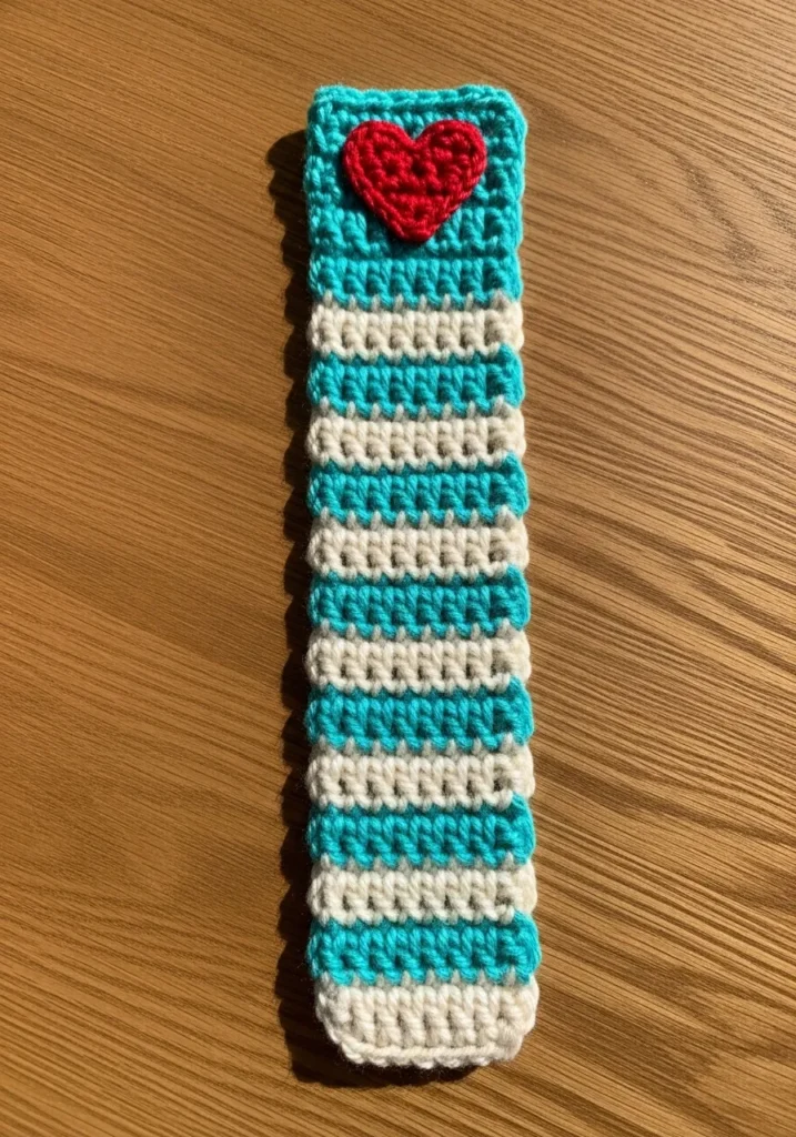 This slim and stylish accessory is a reader’s delight, featuring alternating bands of creamy white and vibrant turquoise yarn. The bookmark is worked in a repetitive ribbed stitch that creates a textured, slightly raised surface, ensuring it stays securely between the pages of your favorite book. At the very top, a bright red heart appliqué provides a punch of color and a sentimental touch, making it look as though a little bit of love is peeking out from your novel. Its clean, rectangular shape and sturdy edges give it a professional finish that is far more durable than any paper alternative.
