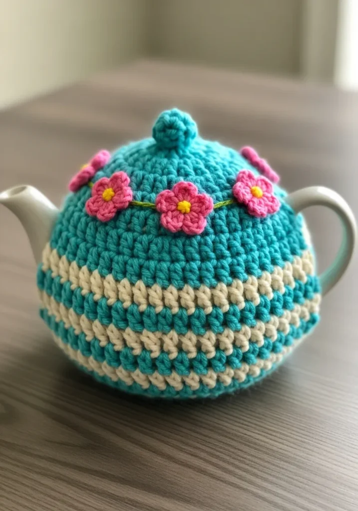 This charming tea cozy turns a simple ceramic pot into a whimsical garden centerpiece with its vibrant turquoise and cream striped body. The design features a rounded dome shape worked in thick, textured stitches that provide excellent insulation to keep your tea steeping at the perfect temperature. Encircling the top is a delicate vine of tiny pink blossoms, each finished with a sunny yellow center, which adds a beautiful 3D floral element to the piece. A matching turquoise knob at the very top serves as both a practical handle and a polished finishing touch to the overall garden-inspired aesthetic.