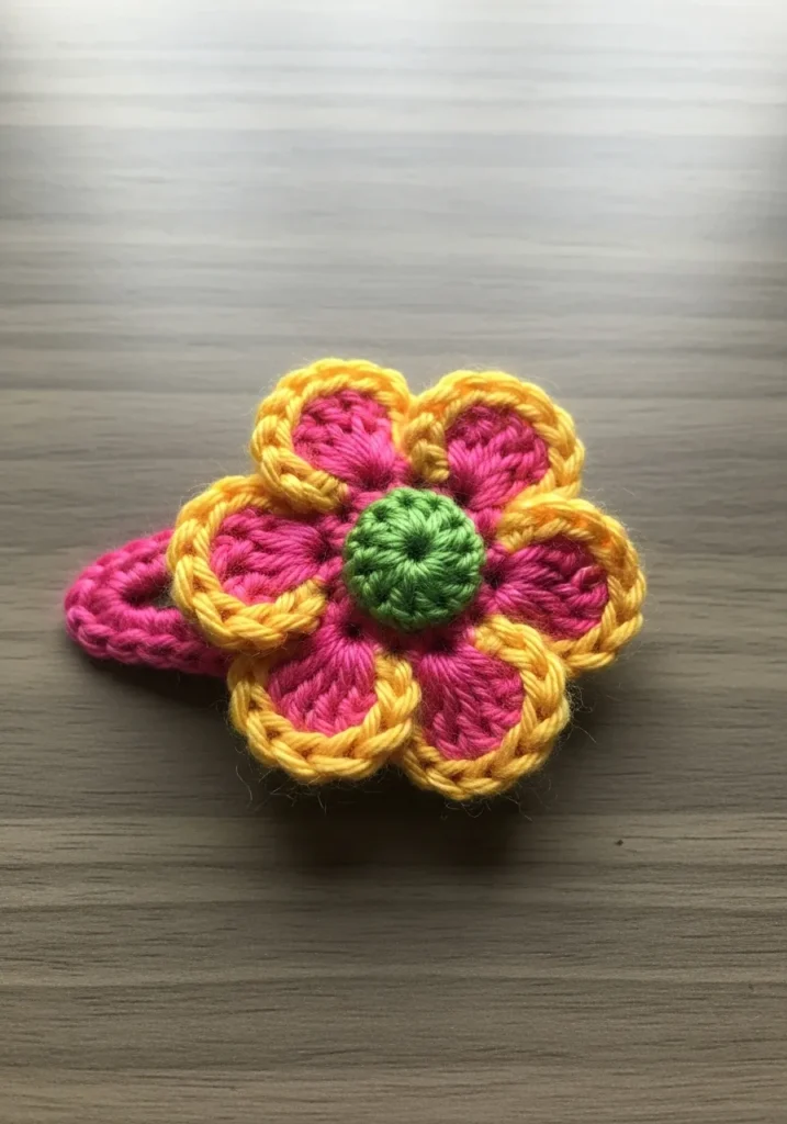 This eye-catching accessory features a vibrant pink blossom that pops against any hair color. The flower is designed with five rounded petals, each highlighted by a bright yellow border that adds a crisp, sun-drenched finish. At its heart sits a small, textured green center, perfectly mimicking the look of a real wildflower. The entire floral piece is securely attached to a matching pink crocheted base, which hides a sturdy metal clip for a functional and fashionable hold.
