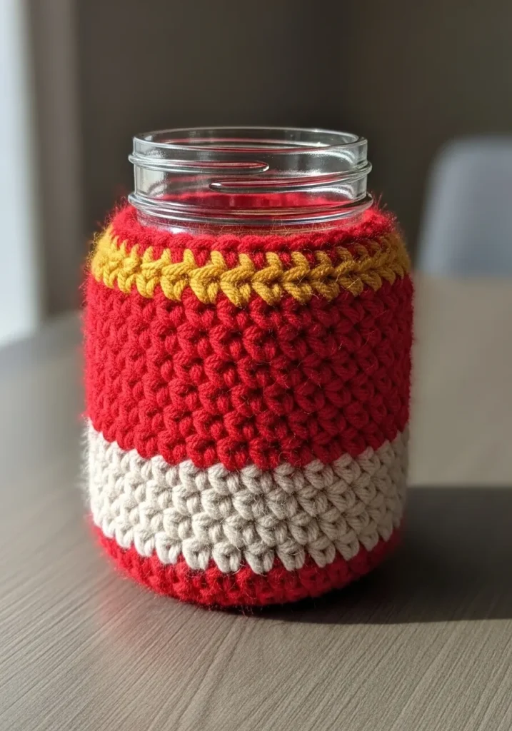I’m a huge fan of this project because it’s the perfect way to practice “shaping for utility.” If you’ve mastered basic cylindrical shapes, this sleeve challenges you to maintain consistent tension so it slides perfectly onto the jar without being too loose. It’s a fantastic way to turn everyday recycling into stylish home decor, whether you’re using it as a rustic pencil holder, a flower vase, or a cozy way to hold your iced tea. You’ll love how that mustard yellow trim adds just the right amount of detail to make the whole project feel intentionally designed and professional.