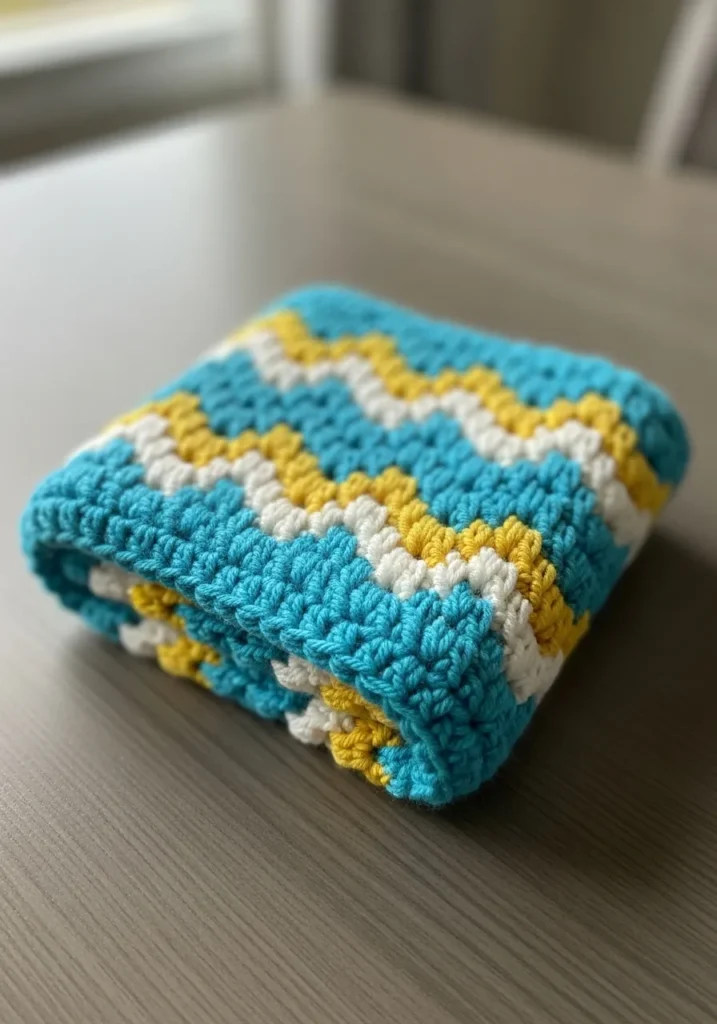 The final piece in the collection is a beautifully folded baby blanket that brings together several skills learned in previous projects. It features a rhythmic ripple or chevron pattern with alternating rows of serene turquoise, sunny yellow, and crisp white yarn. The blanket is worked in a medium-weight, soft-textured yarn that gives it a lovely drape and a plush feel, making it perfect for a nursery. The stitches are uniform and dense, ensuring the blanket is as durable as it is decorative, with the zigzag edges providing a classic, timeless look.