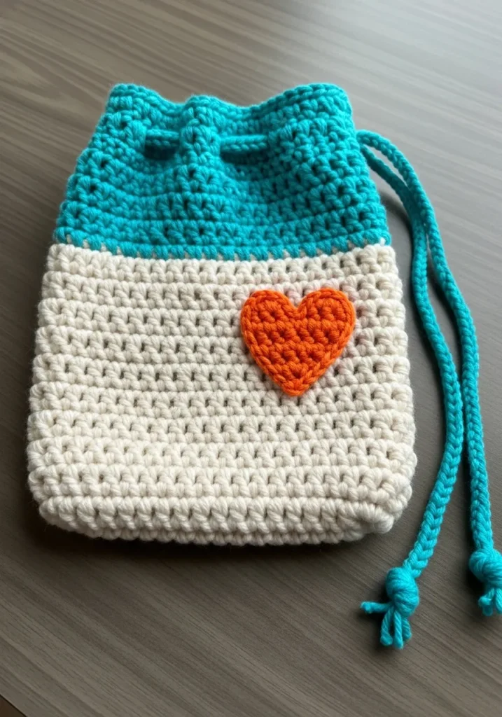 This charming little bag is a masterclass in clean lines and sweet details with its creamy white body and bright turquoise top. The bottom section features a dense, even texture that feels incredibly secure, while the upper portion is worked in a slightly more open stitch to allow for easy cinching. A vibrant orange heart sits right in the center as a lovely focal point, giving the whole design a warm and inviting personality. Long braided cords in a matching blue shade provide a practical closure that adds a bit of nautical flair to the overall aesthetic.