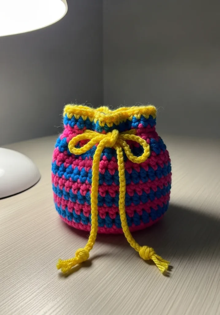 I’m completely obsessed with this color combo because it feels like a total throwback to 90s nostalgia. If you are looking to move beyond solid colors, this alternating pattern is a fantastic way to practice keeping your yarn strands tidy as you work. It is the ultimate little treasure bag for stashing your stitch markers or jewelry, and it is small enough that you can finish it during a single podcast episode. You will love how the bright yellow cord makes the whole thing pop, and it is such a fun way to experiment with high-contrast yarn without a massive commitment.