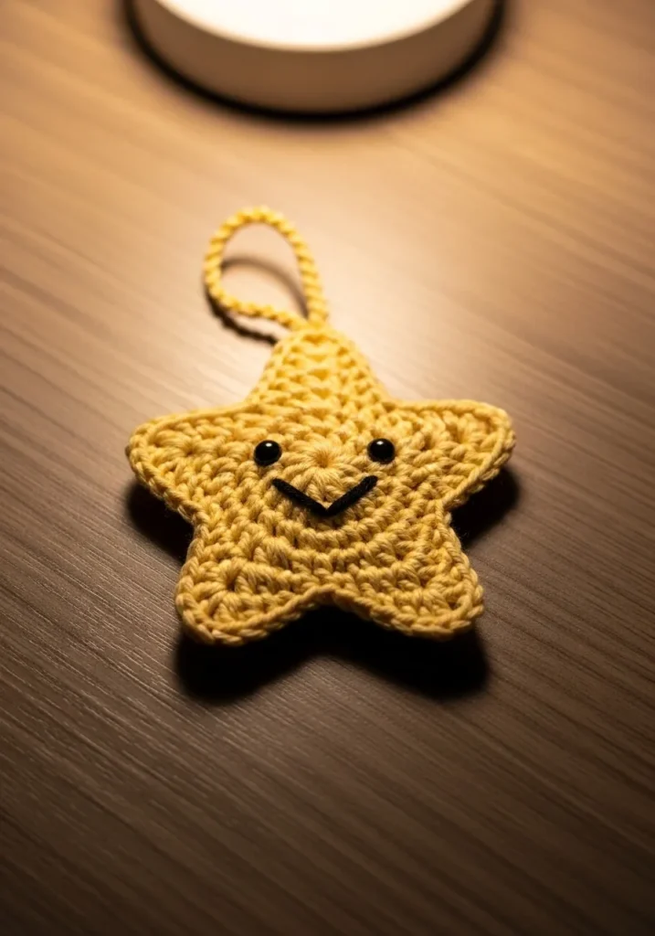 This happy little crochet star is stitched in a sunny yellow yarn with neat, even rounds that create a solid and slightly textured surface. A simple loop at the top makes it easy to hang, and the embroidered smile gives it a playful vibe. The compact design keeps it lightweight while still holding its shape beautifully.
