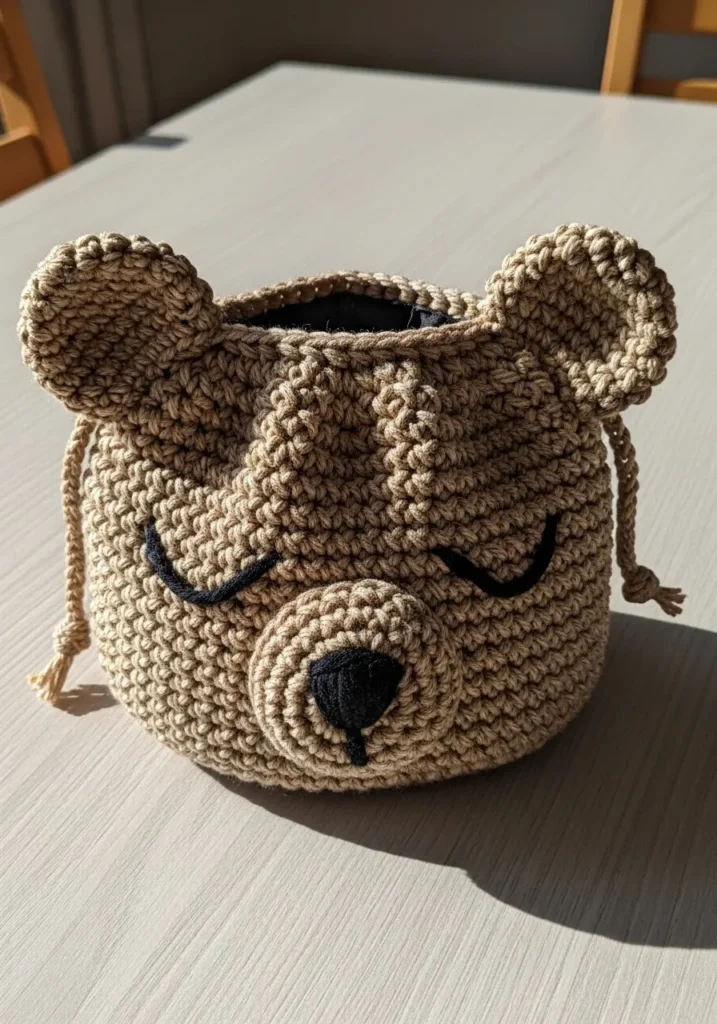 This cozy crochet basket is shaped like a bear face, complete with rounded ears and stitched closed eyes that give it a peaceful expression. The yarn is a warm taupe shade with a slightly chunky texture, helping the basket keep its structure while still feeling soft. The snout detail adds dimension, and the sturdy base makes it practical for holding small items like yarn scraps or craft tools.