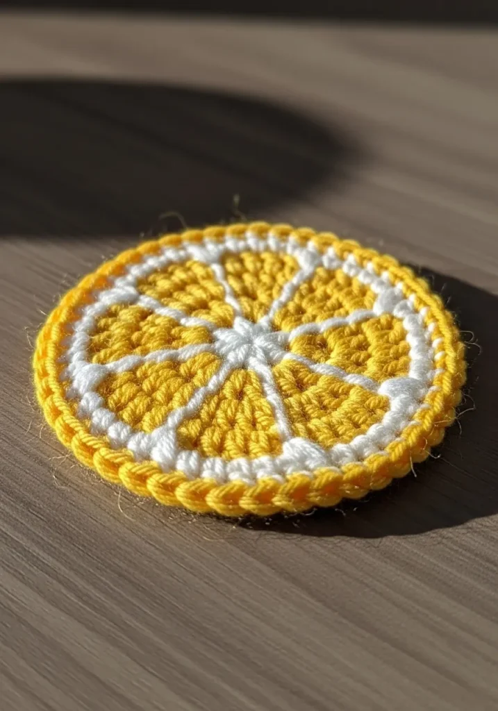 This bright crochet coaster is designed to look like a juicy lemon slice, with segments of white and vibrant yellow arranged in neat triangular sections. The outer edge is finished with a slightly thicker yellow border that frames the piece beautifully. The stitches are tight and clean, giving it a crisp circular shape that lies flat on the table. It is cheerful, bold, and instantly eye catching.