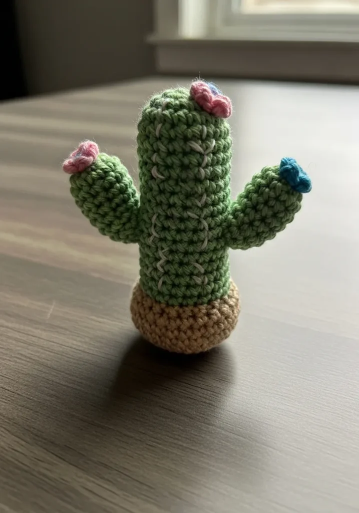 This petite crochet cactus is worked in textured green stitches that mimic the ribbed look of a real plant. It sits in a small neutral pot, and tiny pink and blue blossoms on the arms add the cutest pop of color. The compact shape and upright structure make it perfect for decorating small spaces. The contrast between the soft yarn and structured silhouette gives it a charming handmade feel.