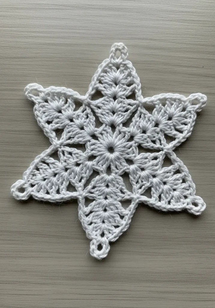 I always find snowflake patterns so calming to make. The repetition of the stitches feels almost rhythmic, and watching the shape reveal itself is oddly satisfying. It is a lovely small project for using up leftover white yarn, and it instantly adds a cozy handmade touch to a tree or window. I love how something so simple can look so detailed and impressive.