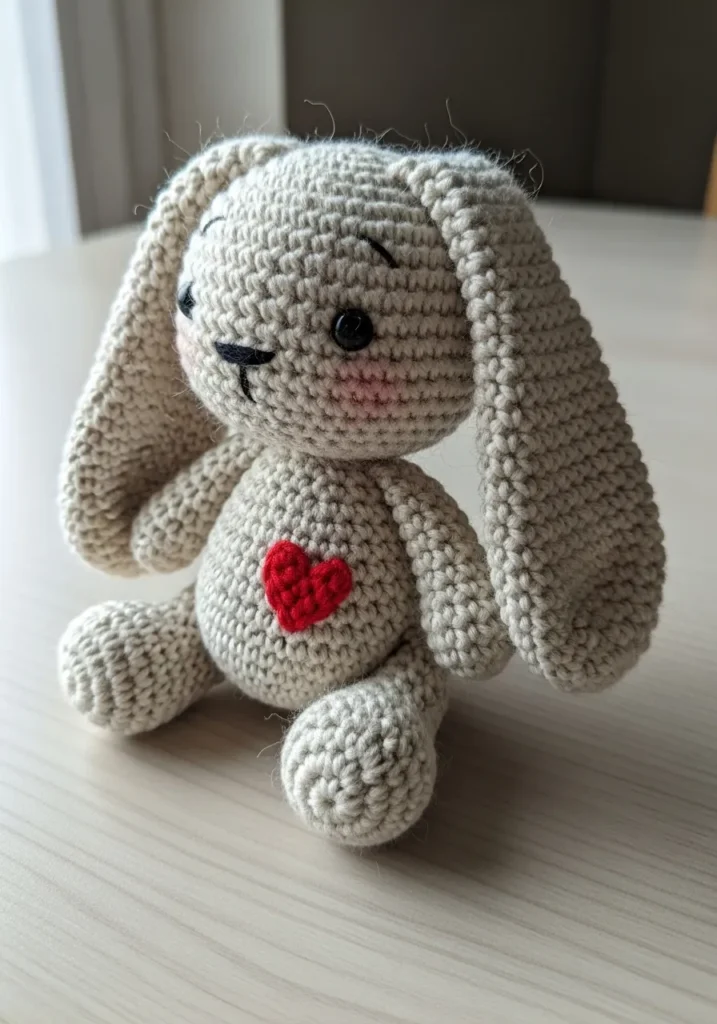 This precious crochet bunny is worked in a soft cream yarn with long floppy ears and tiny stitched features. Its small black eyes and gentle smile give it a sweet expression, while the bright red heart on its chest adds the cutest pop of color. The tight stitches keep the body firm and structured, yet it still looks soft and huggable. The overall design feels simple, warm, and full of personality.