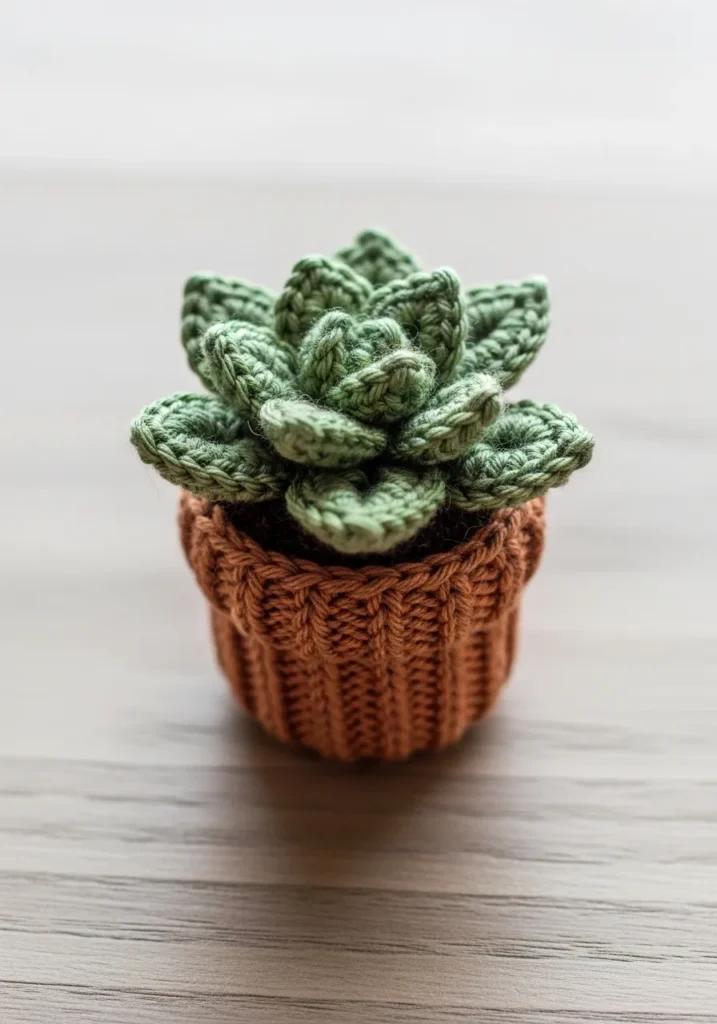 This charming mini succulent is crocheted in soft green yarn with layered leaves that form a realistic rosette shape. The leaves have subtle stitch definition that adds depth and texture, while the tiny pot is worked in a warm terracotta shade with ribbed detailing. The contrast between the smooth leaves and the textured pot gives the whole piece a balanced, handcrafted look. It feels sturdy yet delicate at the same time.