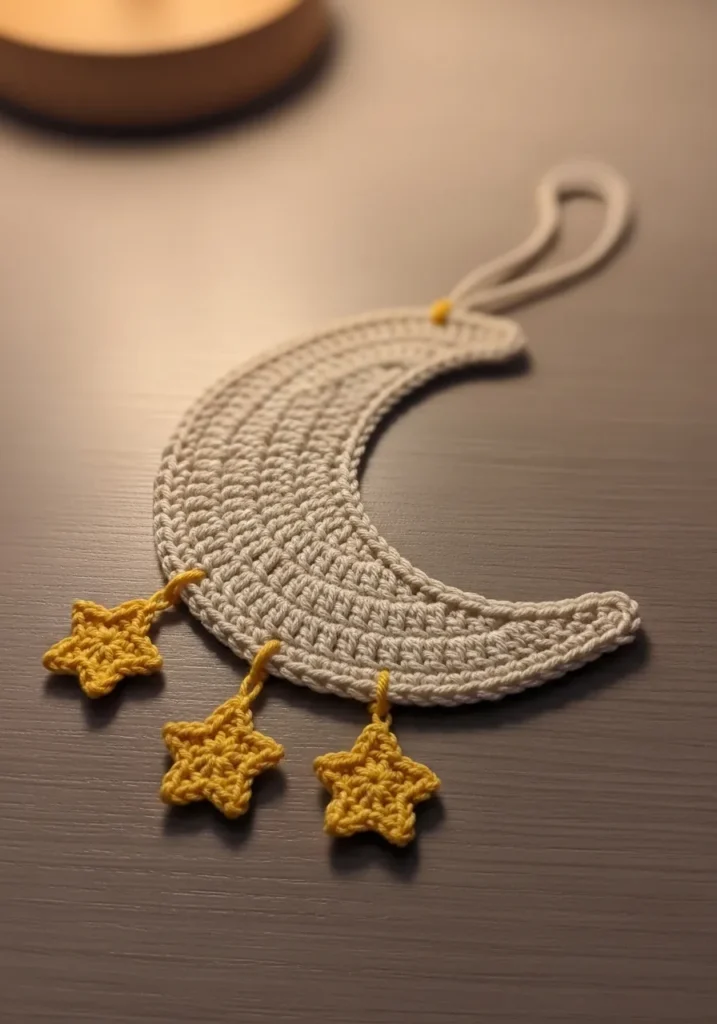 This delicate crescent moon wall hanging is crocheted in a soft neutral yarn with clean, even stitches that highlight its curved shape. Small dangling stars in a warm golden shade hang from the bottom, adding movement and a touch of whimsy. The texture is smooth and slightly structured, making the moon hold its form beautifully. A simple loop at the top allows it to hang easily on a wall or hook.