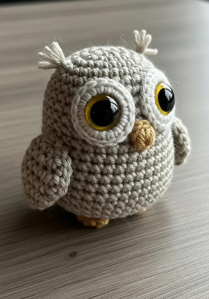 I always smile when I work on animal amigurumi like this. Shaping the body and adding the eyes is the most exciting part because that is when the personality really shows up. It is a fun project for practicing simple shaping techniques without feeling overwhelmed. Plus, who can resist a tiny owl sitting on a desk or bookshelf.