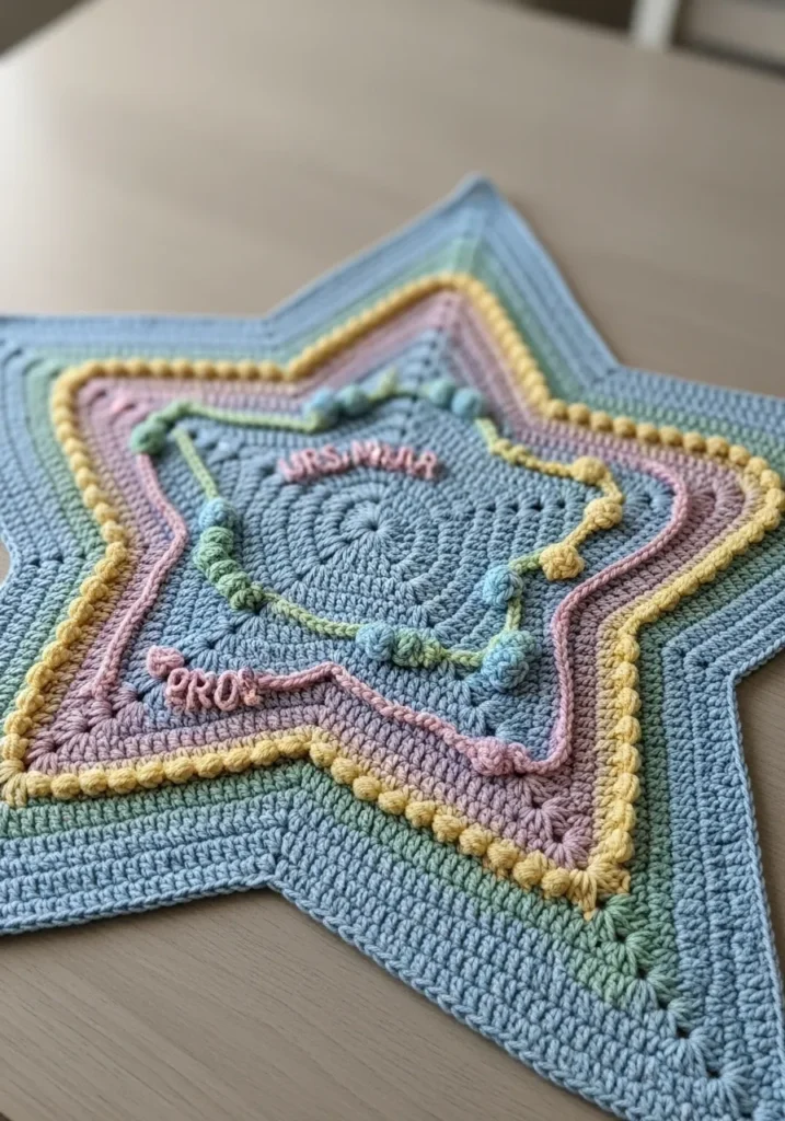 This charming star shaped crochet square is layered with soft pastel shades like baby blue, blush pink, buttery yellow, and mint green. Each round builds outward in a textured stitch pattern that gives the star depth and dimension. The edges are crisp yet cozy, and the color transitions feel playful but gentle at the same time.