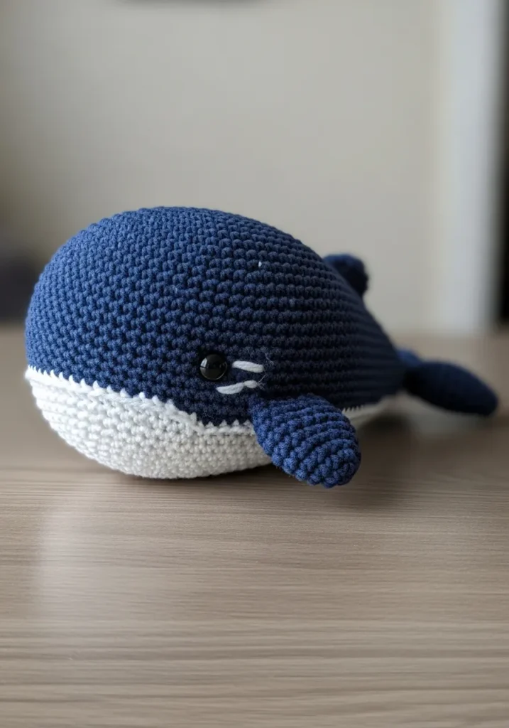 This sweet little whale plush is crocheted in a deep navy blue with a crisp white belly that adds a clean contrast. The rounded body and tiny side fins give it a soft, cuddly shape, while the small safety eyes bring it to life. The stitches are tight and even, creating that smooth amigurumi finish that feels both polished and huggable.