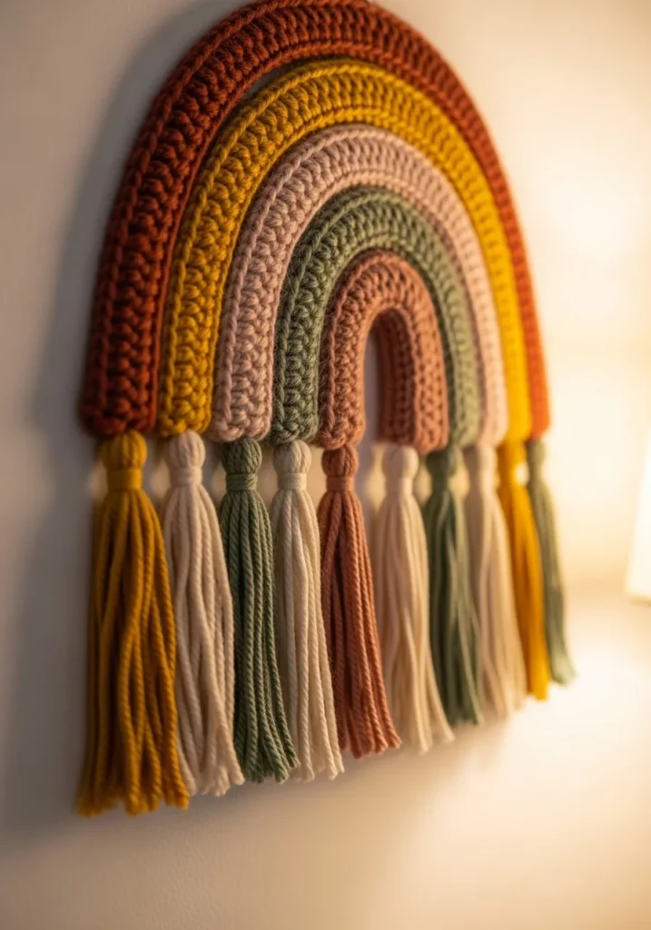 This beautiful crochet rainbow wall hanging blends warm earthy tones like rust, mustard, blush, and cream into layered arches. Each color band is worked in smooth rows that build a soft curved shape, and the bottom is finished with long tassels in matching shades. The texture is cozy yet structured, and the yarn gives it that natural handmade charm that suits a relaxed boho space.