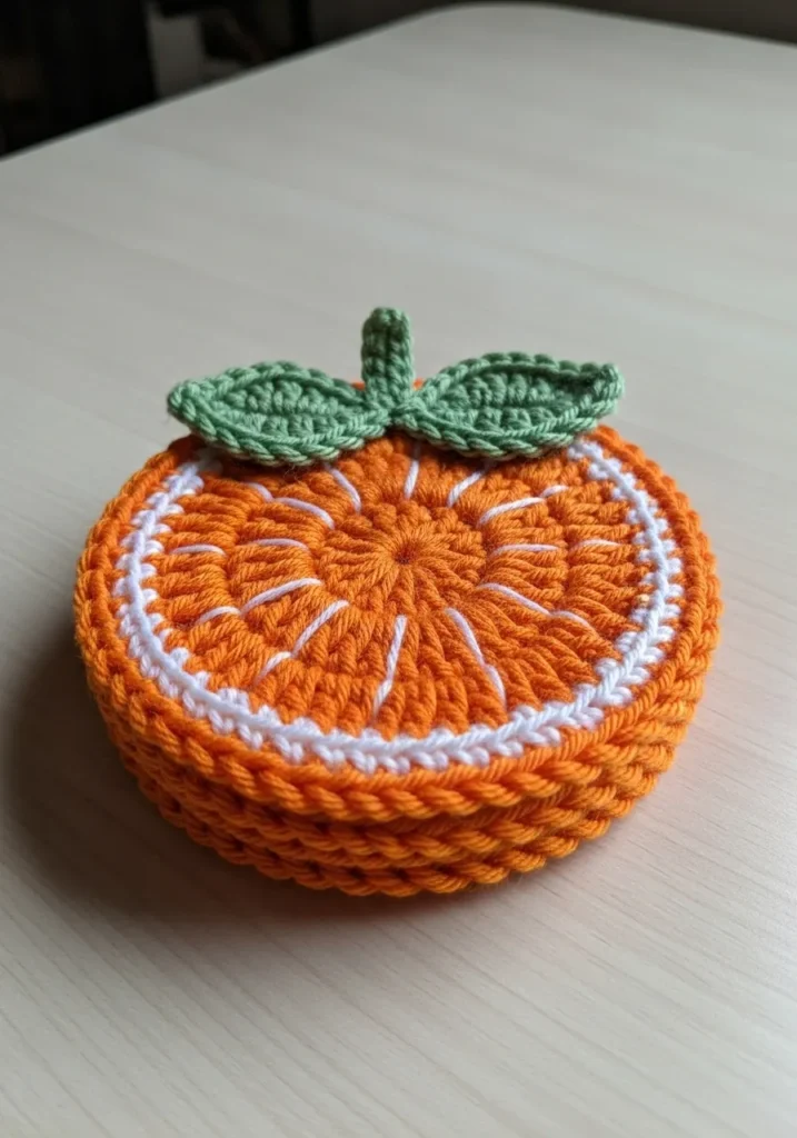 This delightful set of coasters is designed to look exactly like juicy orange slices fresh from the orchard. Each round mat features a vibrant tangerine center with crisp white “pulp” lines radiating out toward a thick and textured orange rind. The top coaster is even topped with two tiny forest green leaves and a little stem for that perfect finishing touch. Made from a durable and absorbent cotton yarn, these pieces have a substantial feel that will protect any wooden surface with ease.
