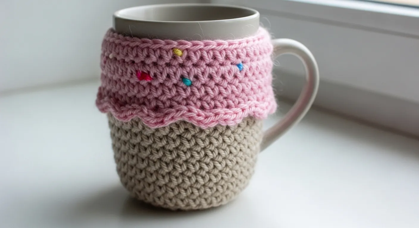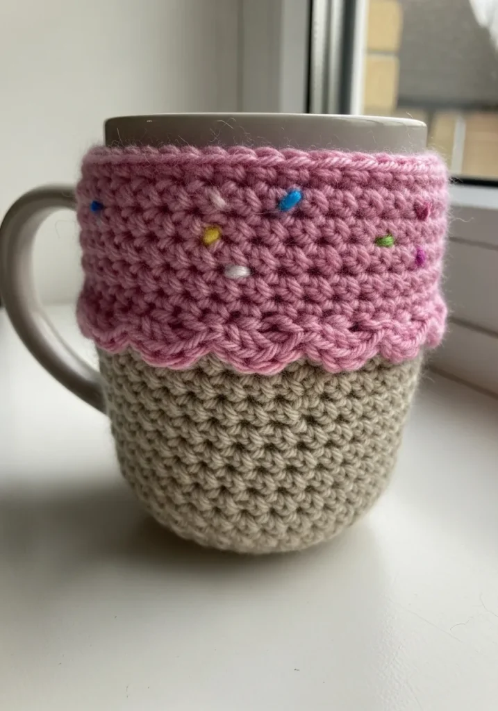 This delightful accessory is designed to look like a perfectly scooped strawberry ice cream cone sitting right on your desk. The bottom section uses a sturdy tan yarn in a textured stitch to represent a classic wafer cone, while the upper portion features a voluminous pink “scoop” with a charming wavy border. Little multicolored stitches are scattered across the pink yarn to look like tiny sugar sprinkles for an extra dose of sweetness. It provides a thick and soft layer of insulation for your favorite mug, which keeps your hands comfortable and your drink at the perfect temperature.