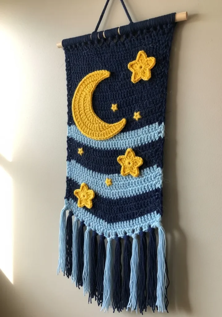 I am completely head over heels for this piece because nursery decor is such a huge market on sites like Etsy. If you’re into creating items that feel like heirlooms, then you will find this project incredibly fulfilling. It is a fantastic way to practice your appliqué skills and play with different yarn weights to get that chunky star look. I love how the fringe gives it a bit of a whimsical vibe while the wooden dowel keeps it looking professional and ready to hang.