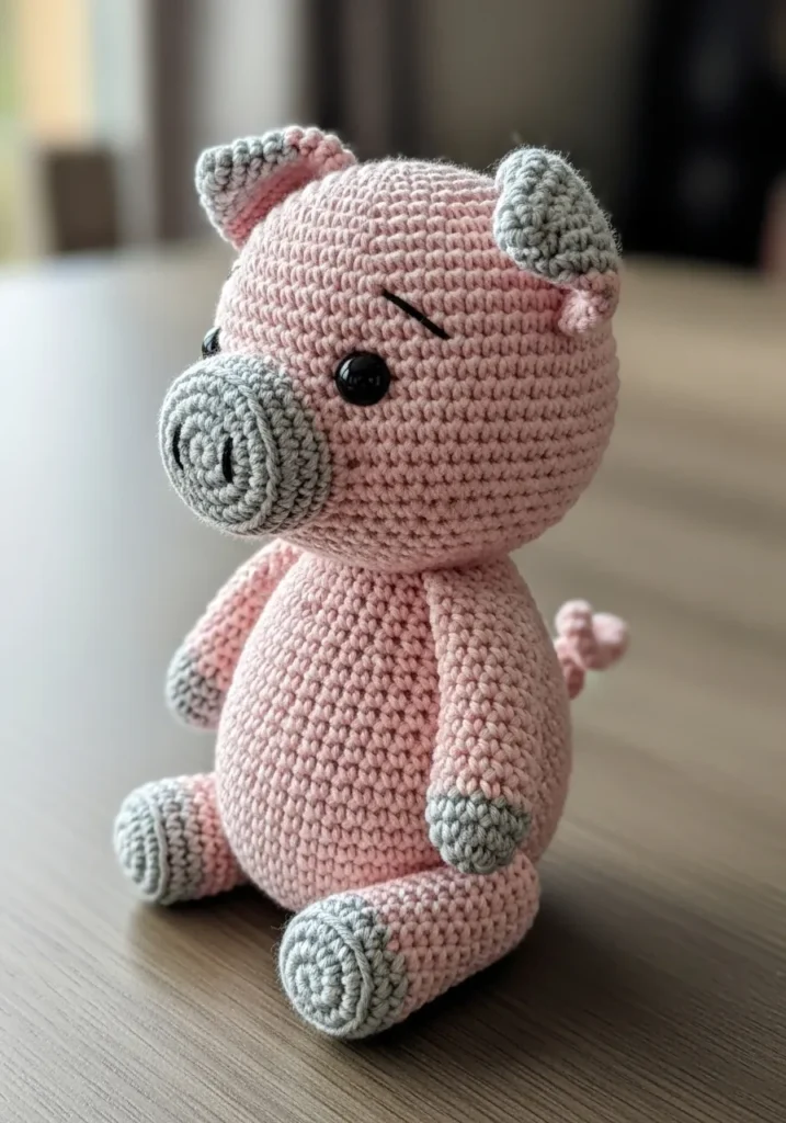 This absolute cutie is a masterclass in amigurumi design with its plump, round body and darling oversized head. It is stitched using a smooth cotton blend yarn in a soft petal pink and features contrasting dove gray accents on its snout, ears, and hooves. The tight single crochet work gives it a firm and sturdy structure, while the shiny black safety eyes and a tiny curly tail add heaps of personality. Its seated pose and thoughtful little eyebrow detail make it look like it is ready for a long chat and plenty of snuggles on a nursery shelf.
